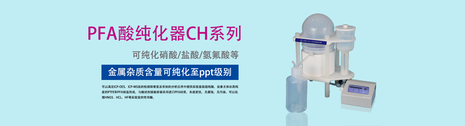 研發生產:痕量分析器皿—PFA、FEP、PTFE系列產品,高壓消解罐,消解器,水熱合成反應釜,酸純化器。